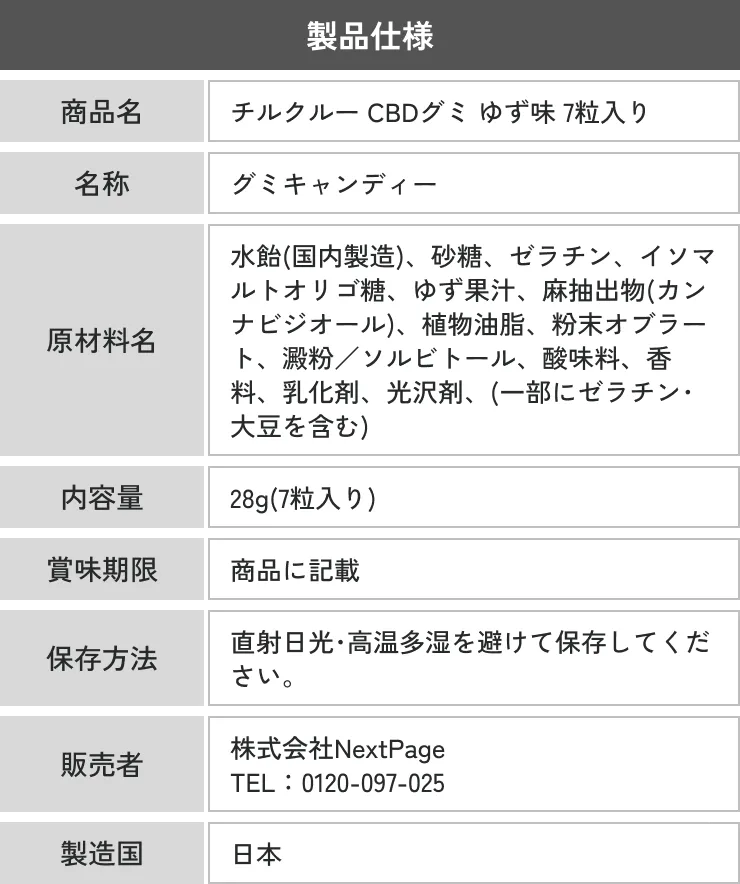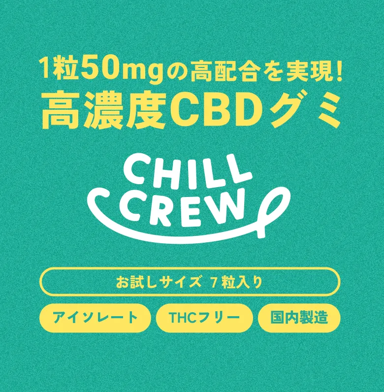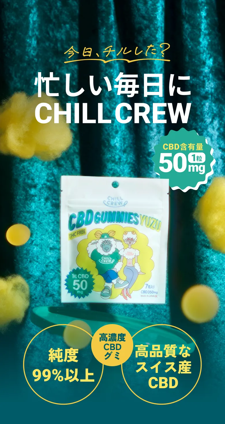 CHILL CREWのCBDグミはCBDのみを抽出し、日本国内で規制されている違法成分は一切配合していないことをお約束します。